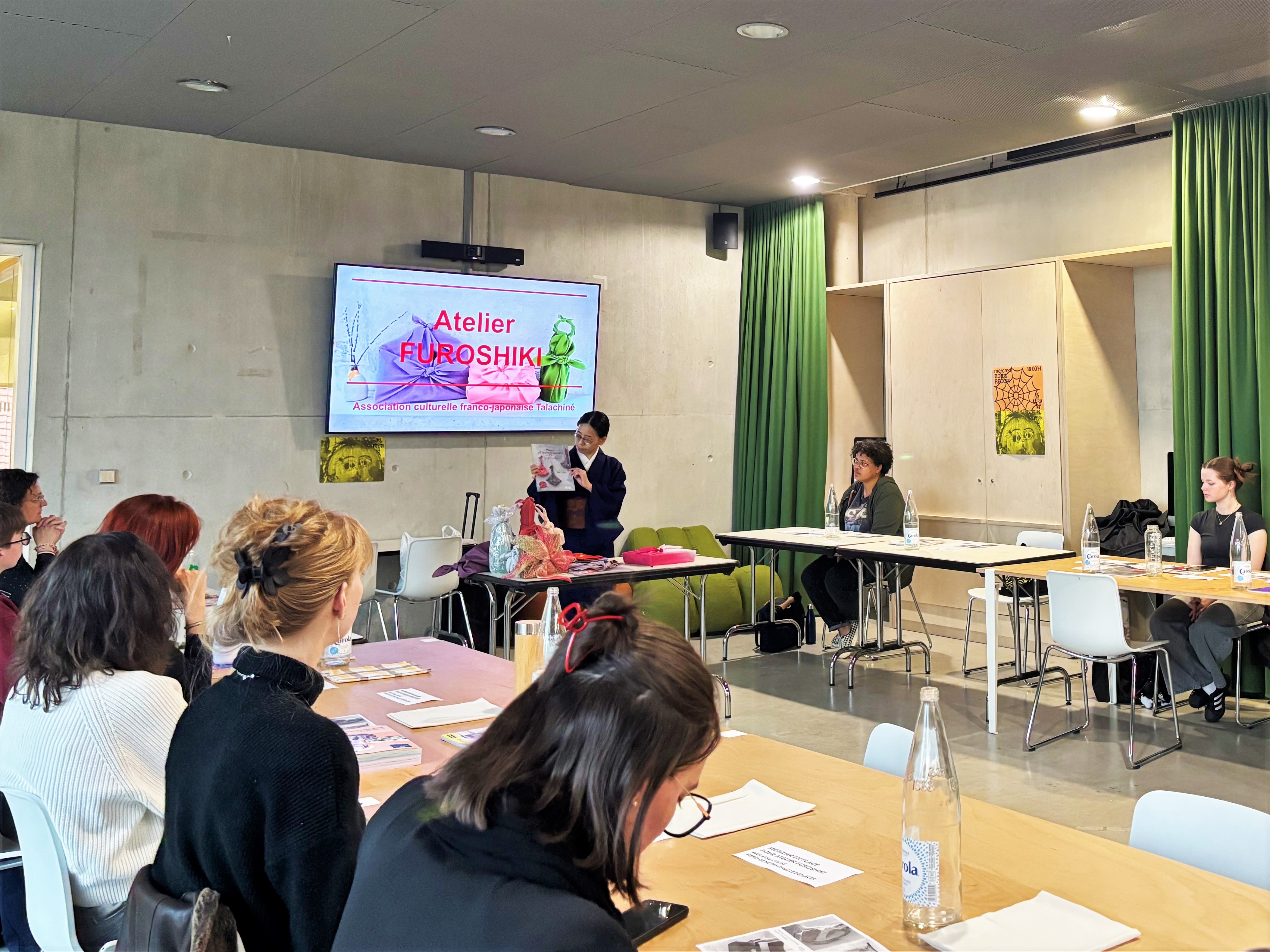Les séances ont été animées par Mme KAJIWARA Akiyo, Présidente de l'association culturelle franco-japonaise Talachiné. Au total, une cinquantaine de participants ont pu découvrir cette pratique japonaise consistant à emballer toutes sortes d’objets et de présents dans des carrés de tissus ; un art esthétique et écologique, qui revient à la mode à l’heure où il est essentiel de réduire notre production de déchet. Le Consul général OEDA était présent pour ces évènements, et l’adjoint au Maire de la ville de Nancy, M. Antoine LE SOLLEUZ, nous a également honorés de sa participation à l'atelier du samedi.