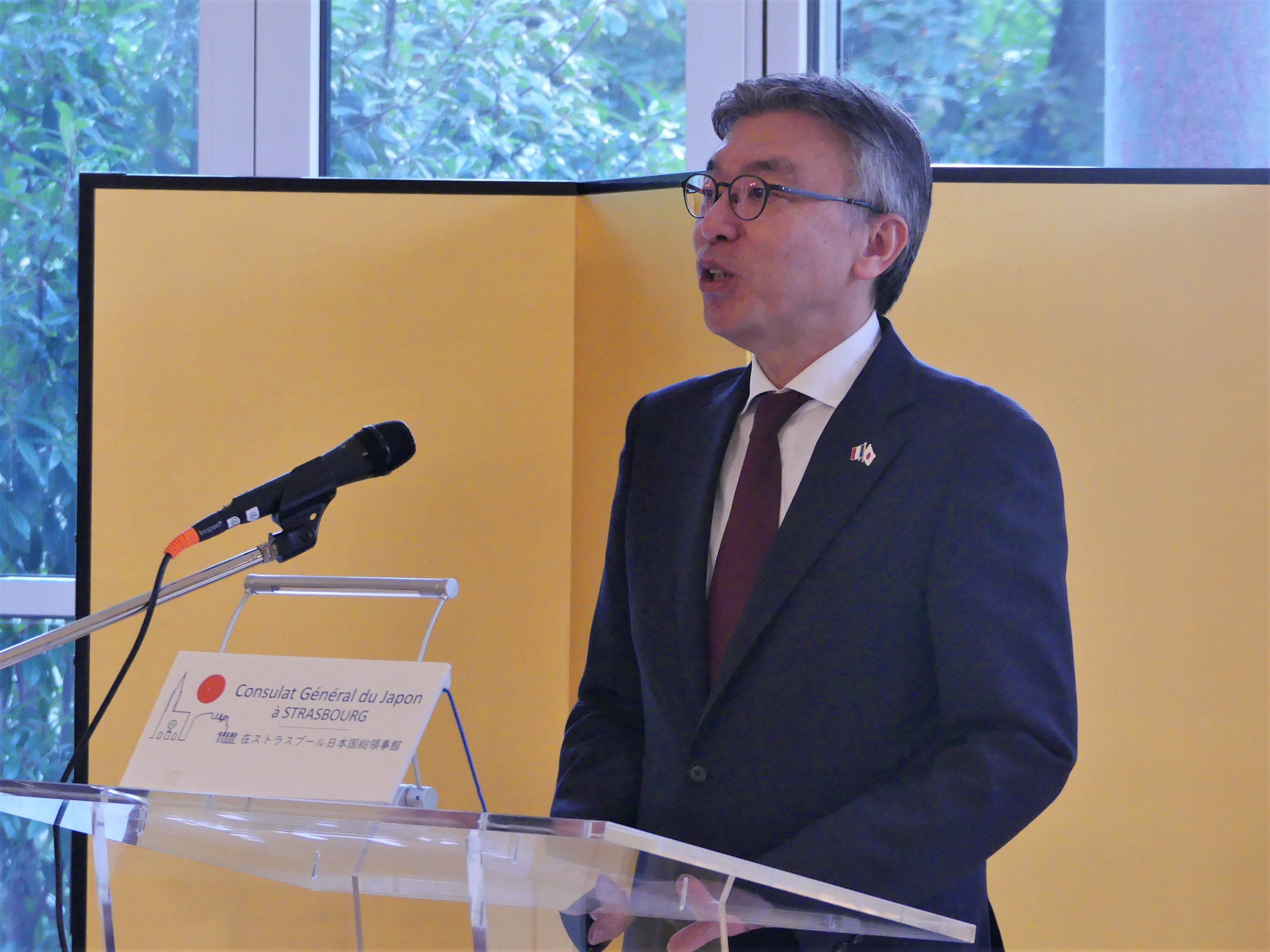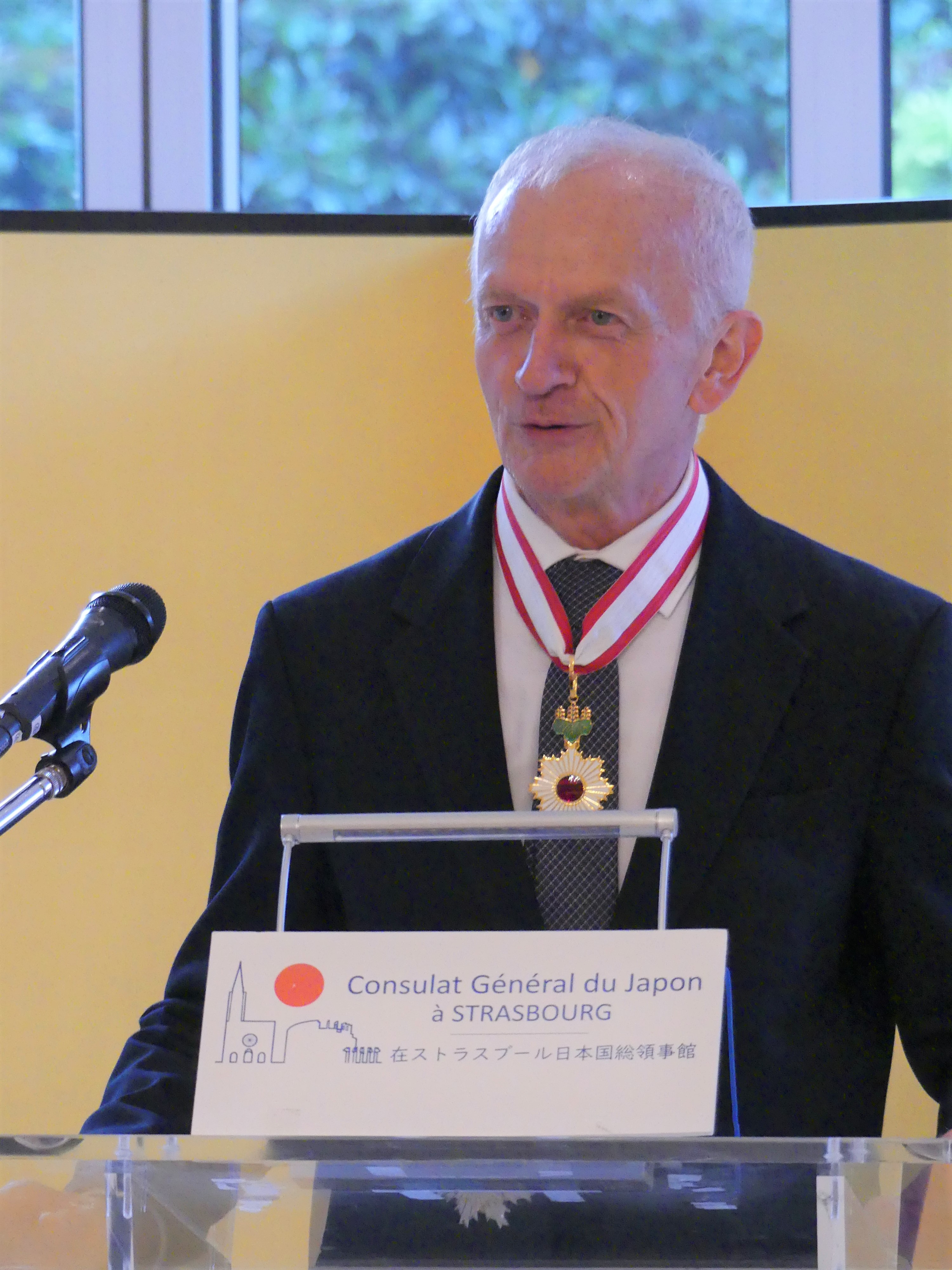 式典には、ストラスブール大学学長フレデリック・ベロ教授をはじめとする多くのストラスブール大学関係者が出席し、デネケン教授は、日本を称賛し、ストラスブール市における国際的な活動において我が国が欠かせない存在であり、両国の友好関係が今後も長く続くことを願うと述べました。