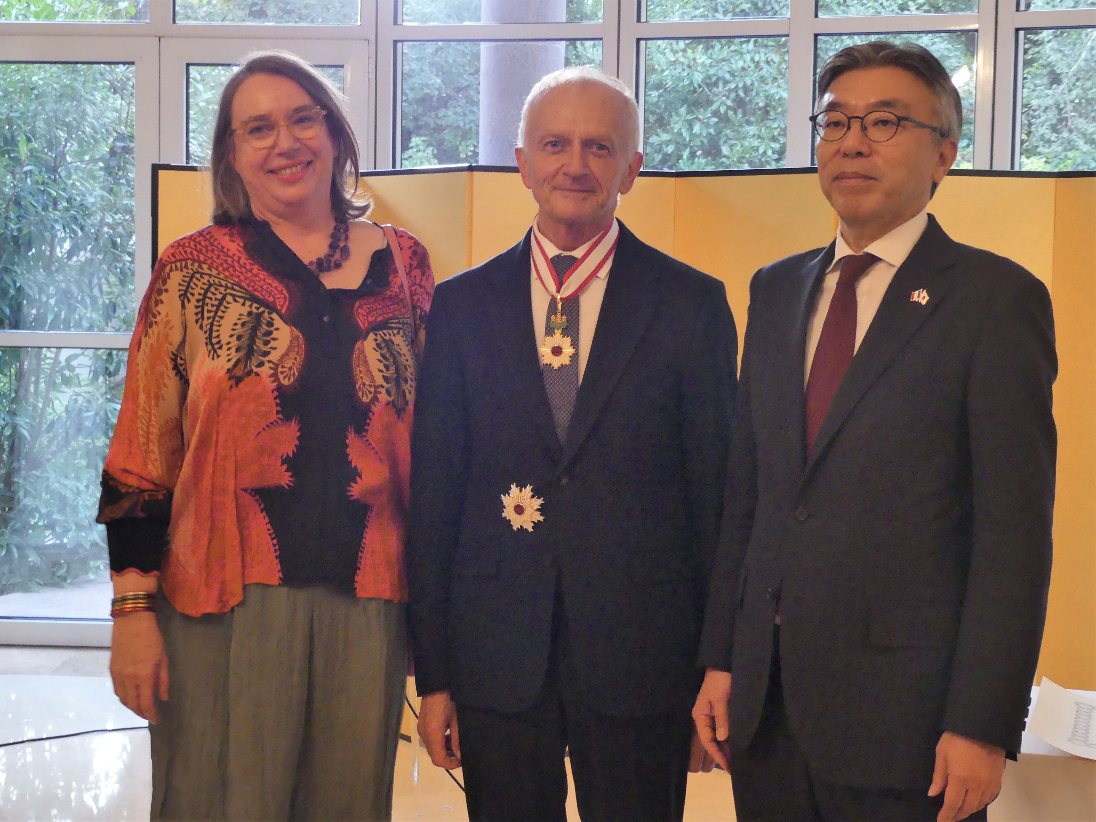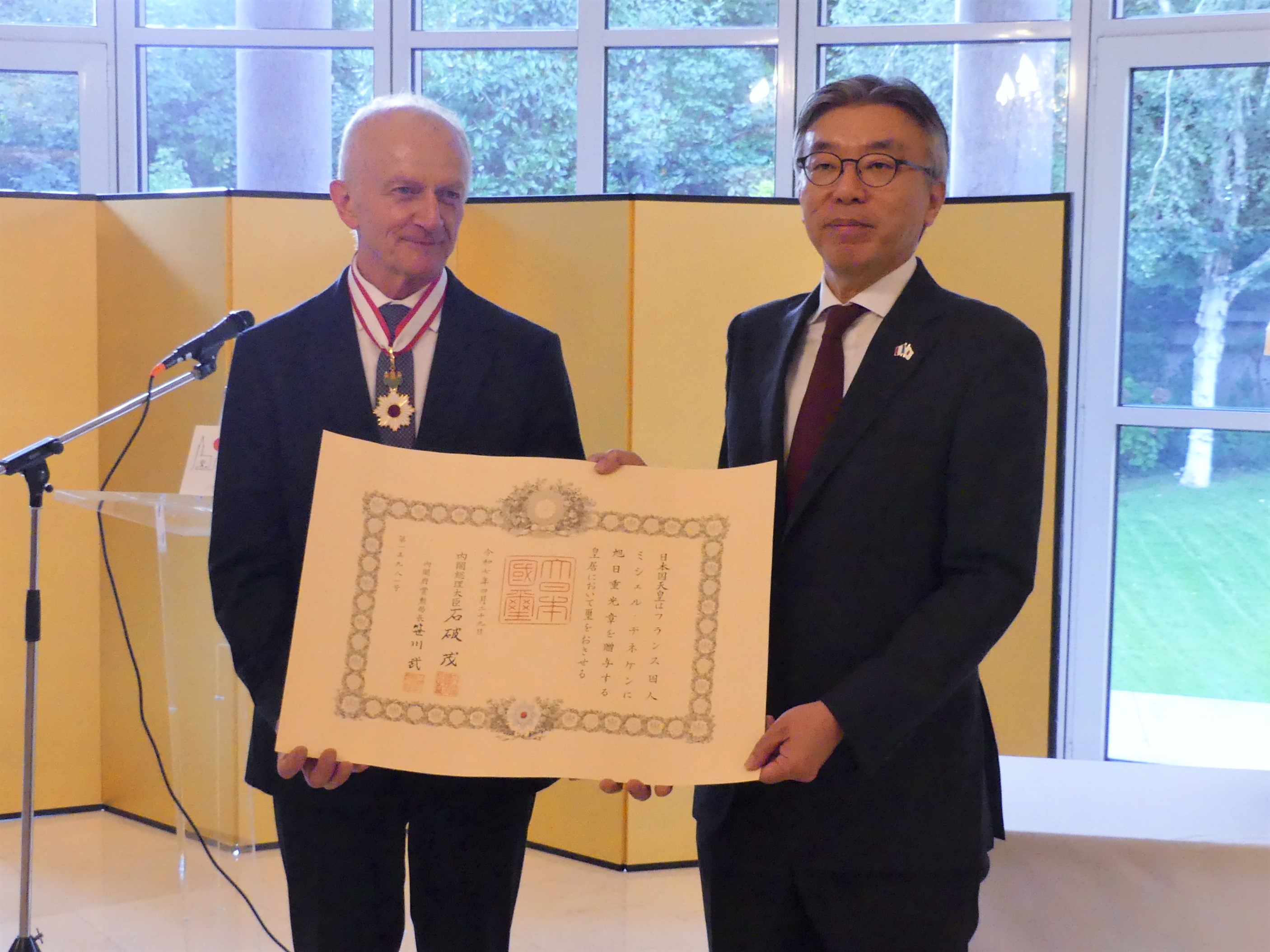 9月12日(金)、総領事公邸において、令和7年度春の外国人叙勲で旭日重光章を受章したミシェル・デネケン教授(元ストラスブール大学学長)への叙勲伝達式が行われました。デネケン教授は、長年に亘り、日本・フランス間の学術交流及び相互理解の促進に貢献してきました。