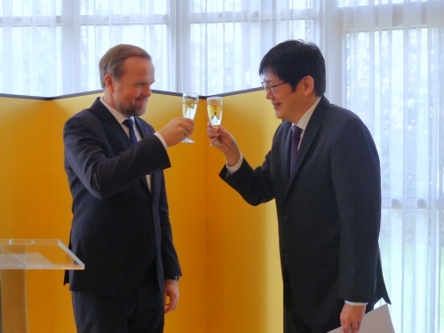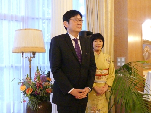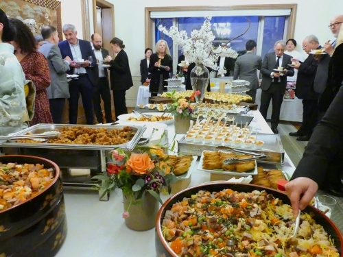 レセプションは二部に分けて行われ、ベルゲ欧州評議会事務次長を始めとする欧州機関関係者や、当地総領事及び名誉領事、文化・学術機関、当地に所在する日本企業等、合計約180名の招待者の皆様にご出席いただき、様々な分野の交流の機会となりました。
