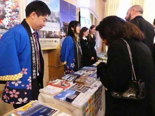 本レセプションには、当館管轄地域内の都市と交流のある金沢市、鹿児島市、神埼市、岩手県及び東京都台東区の計5自治体のブースが設置され、各自治体を紹介する場ともなりました。